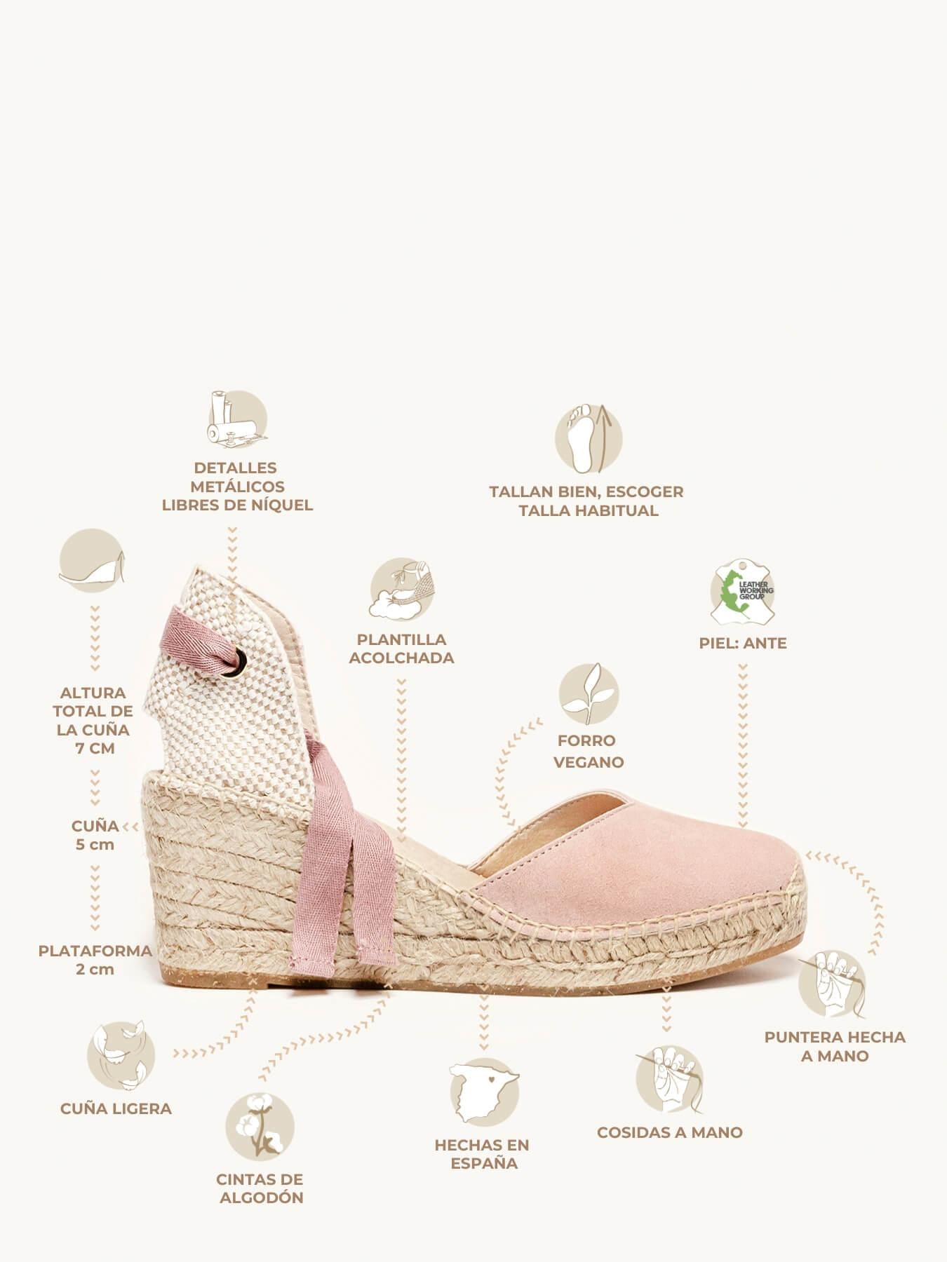 - A camurça da sandália anabela Romero está certificada pelo Leather Working Group (uma organização que promove práticas ambientais sustentáveis)