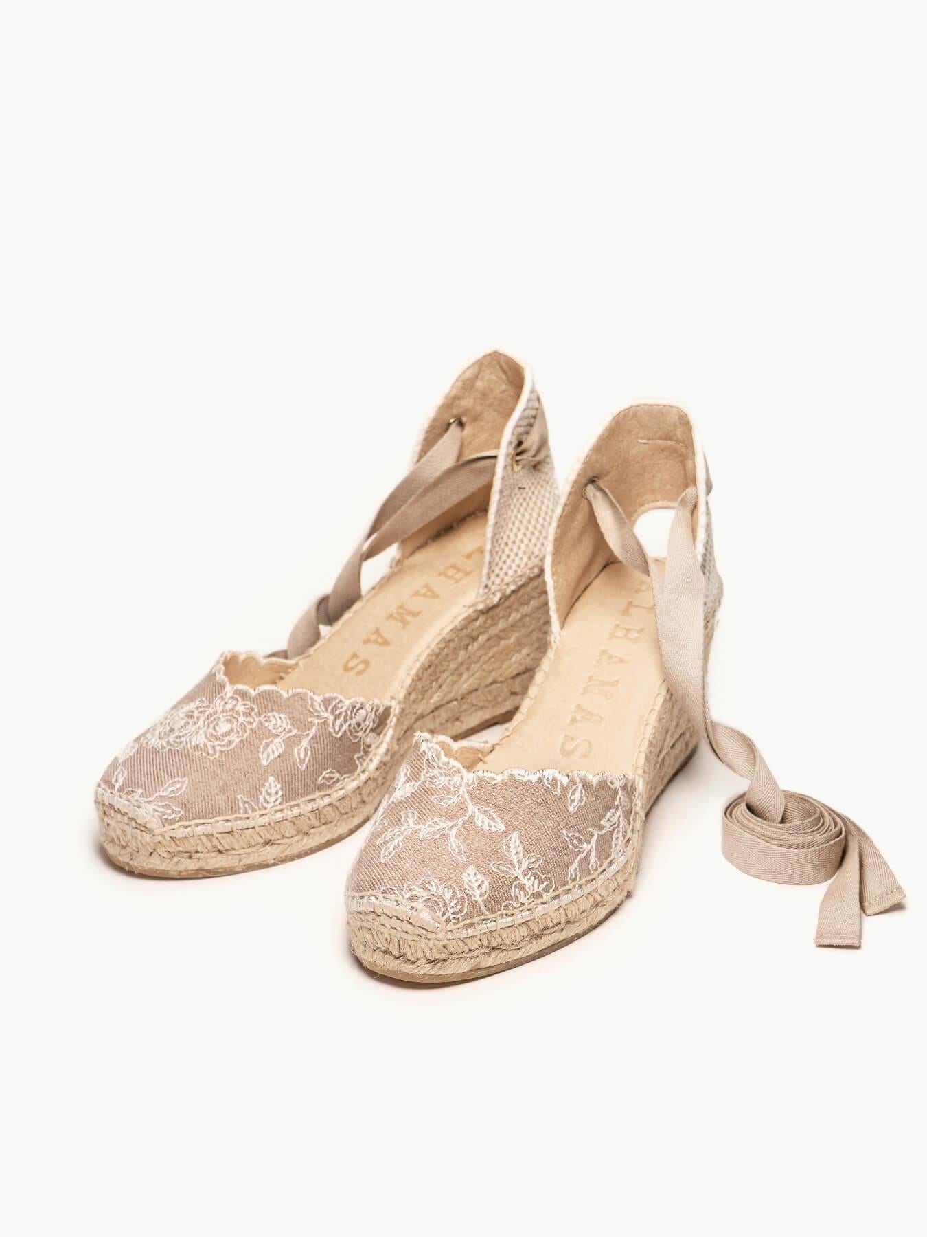 - Anabela de trança de juta natural com sola de borracha reciclada misturada com fibras naturais.