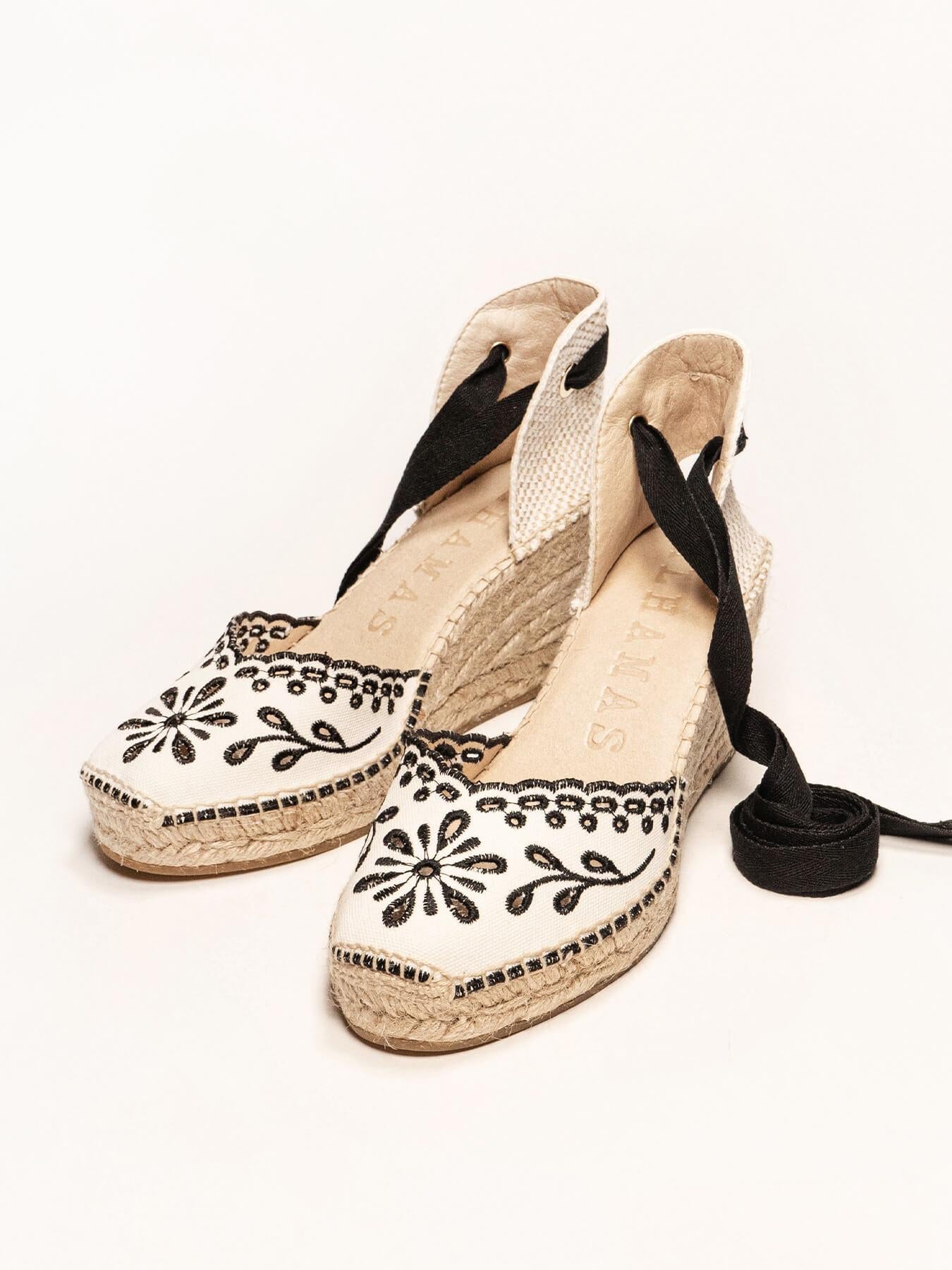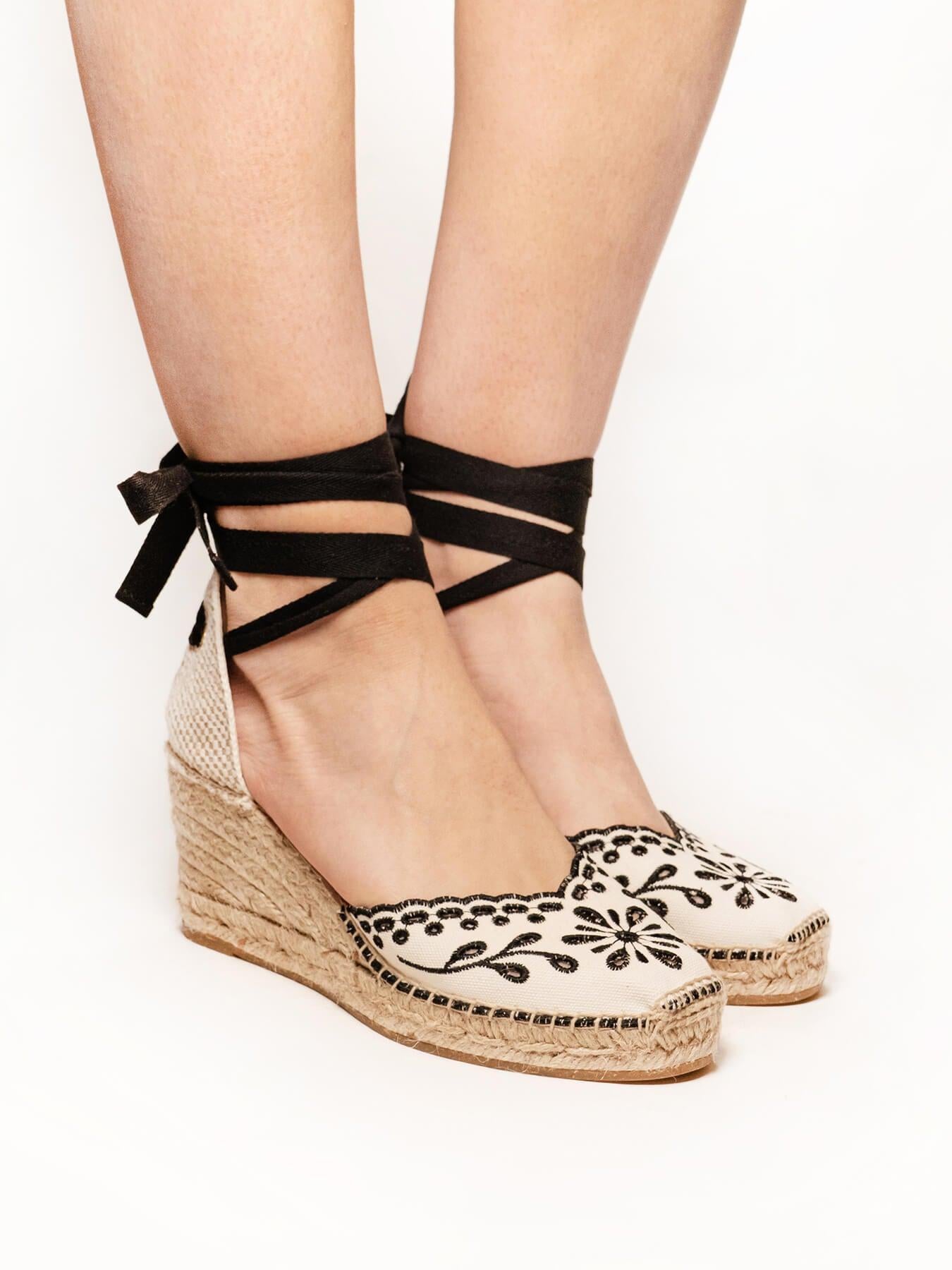 A sandália anabela média Romero é o nosso modelo mais icônico. Uma sandália valenciana de decote coração com fitas que você poderá usar com seus looks especiais e também com os do dia a dia. Você poderá dar um toque especial porque as fitas podem ser trocadas.