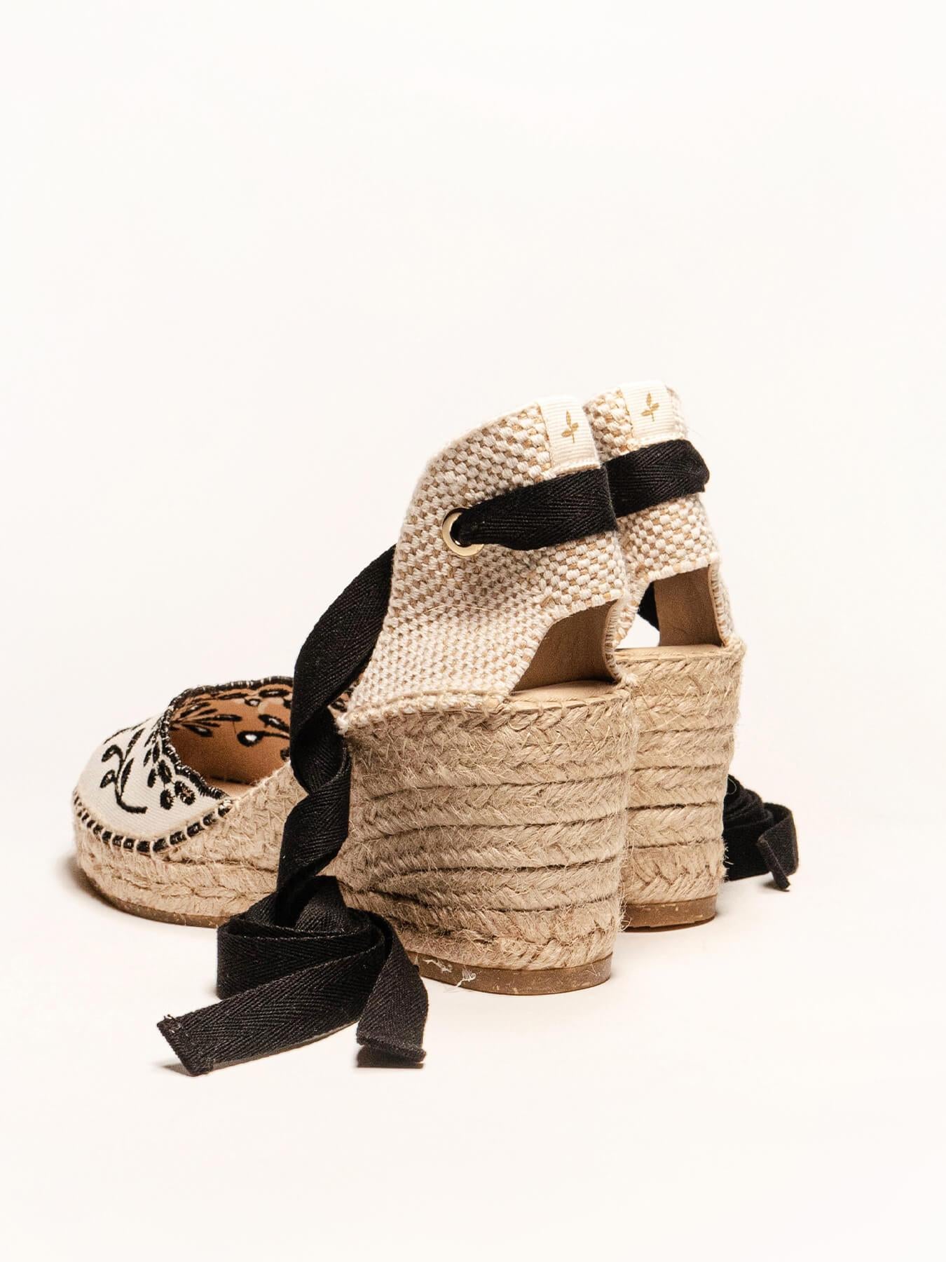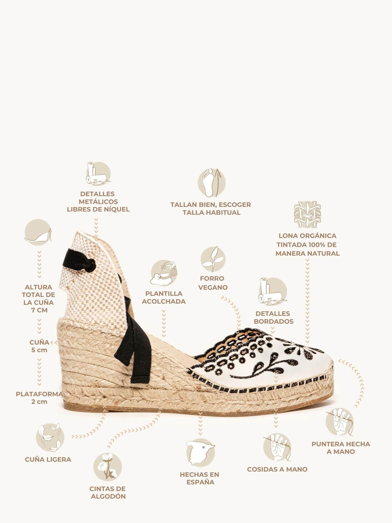 - Anabela trançada de juta natural com solado de borracha reciclada misturada com fibras naturais.