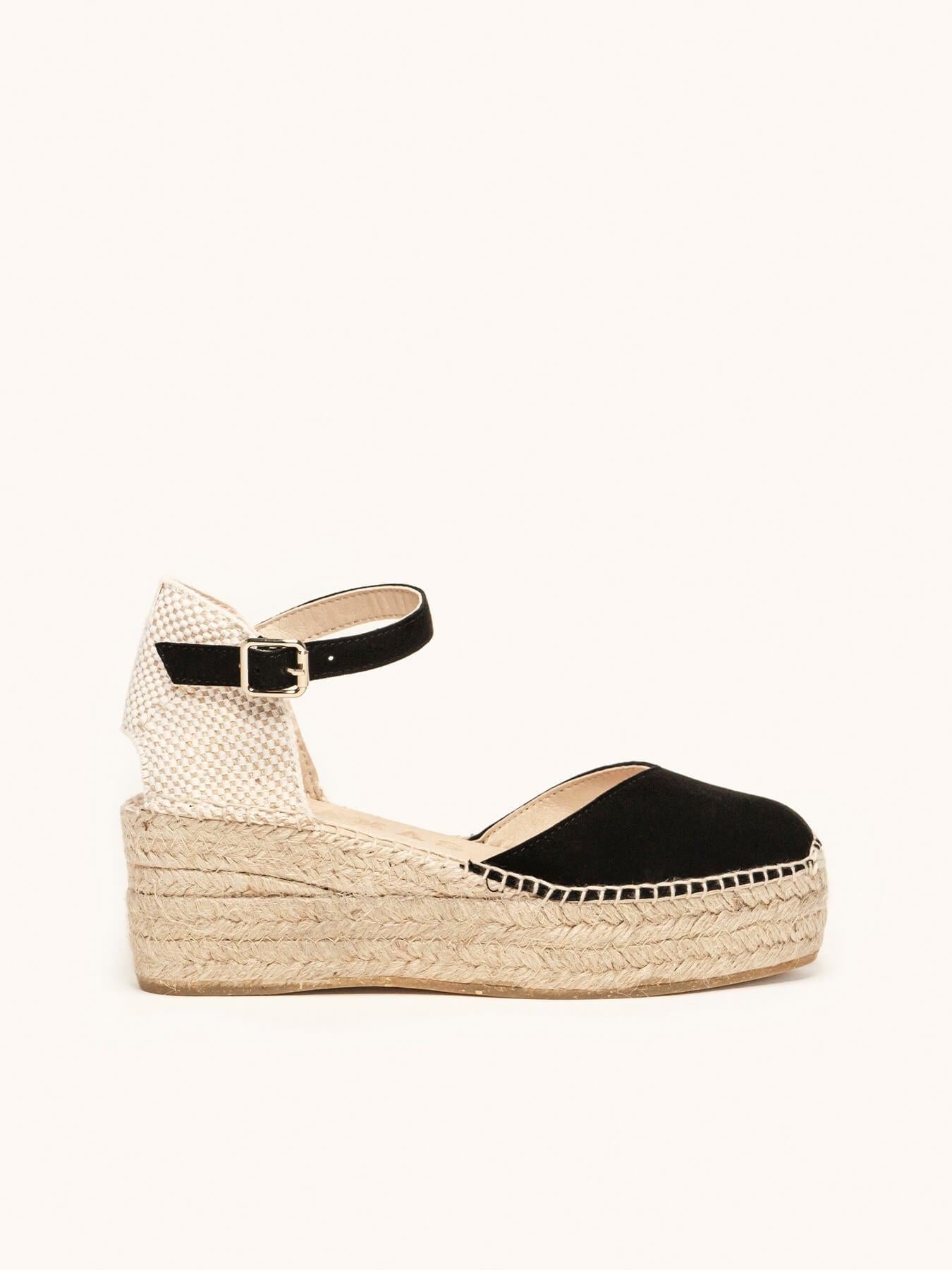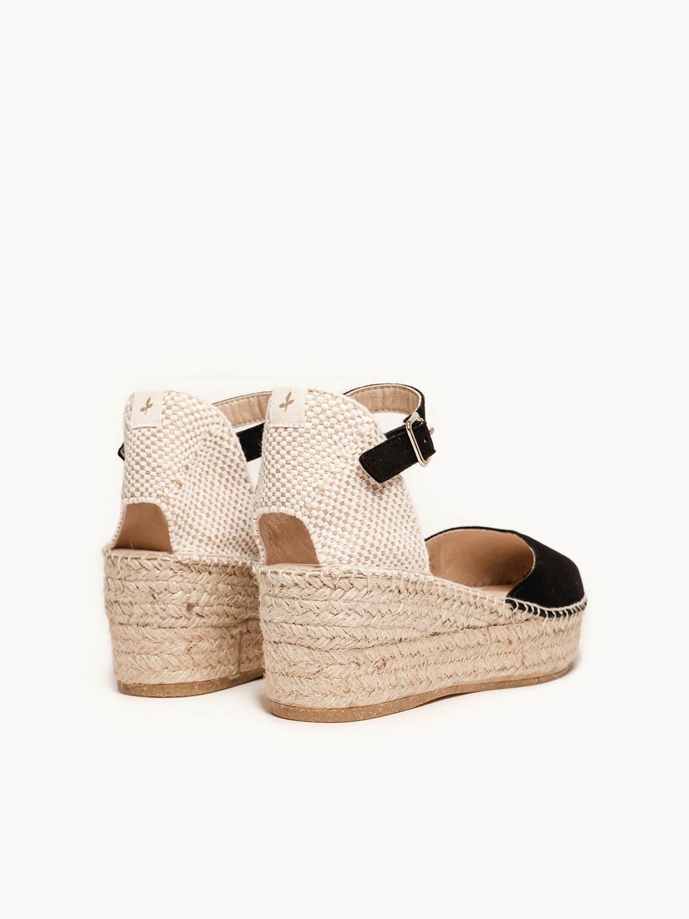 - Anabela de trança de juta natural com sola de borracha reciclada, misturada com fibras naturais.